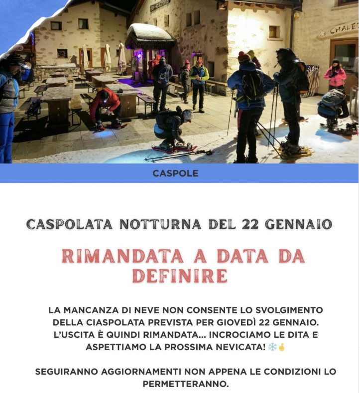Vista la mancanza di neve, il Consiglio ha deciso di rimandare la ciaspolata notturna in programma per giovedì 22 gennaio a data da definire. Noi siamo fiduciosi, incrociamo le dita e aspettiamo la prossima nevicata, così ci divertiremo ancora di più ❄️ Seguiranno aggiornamenti, vi ringraziamo per la comprensione #cai #clubalpinoitaliano #ciaspole #caipezzopontedilegno ...