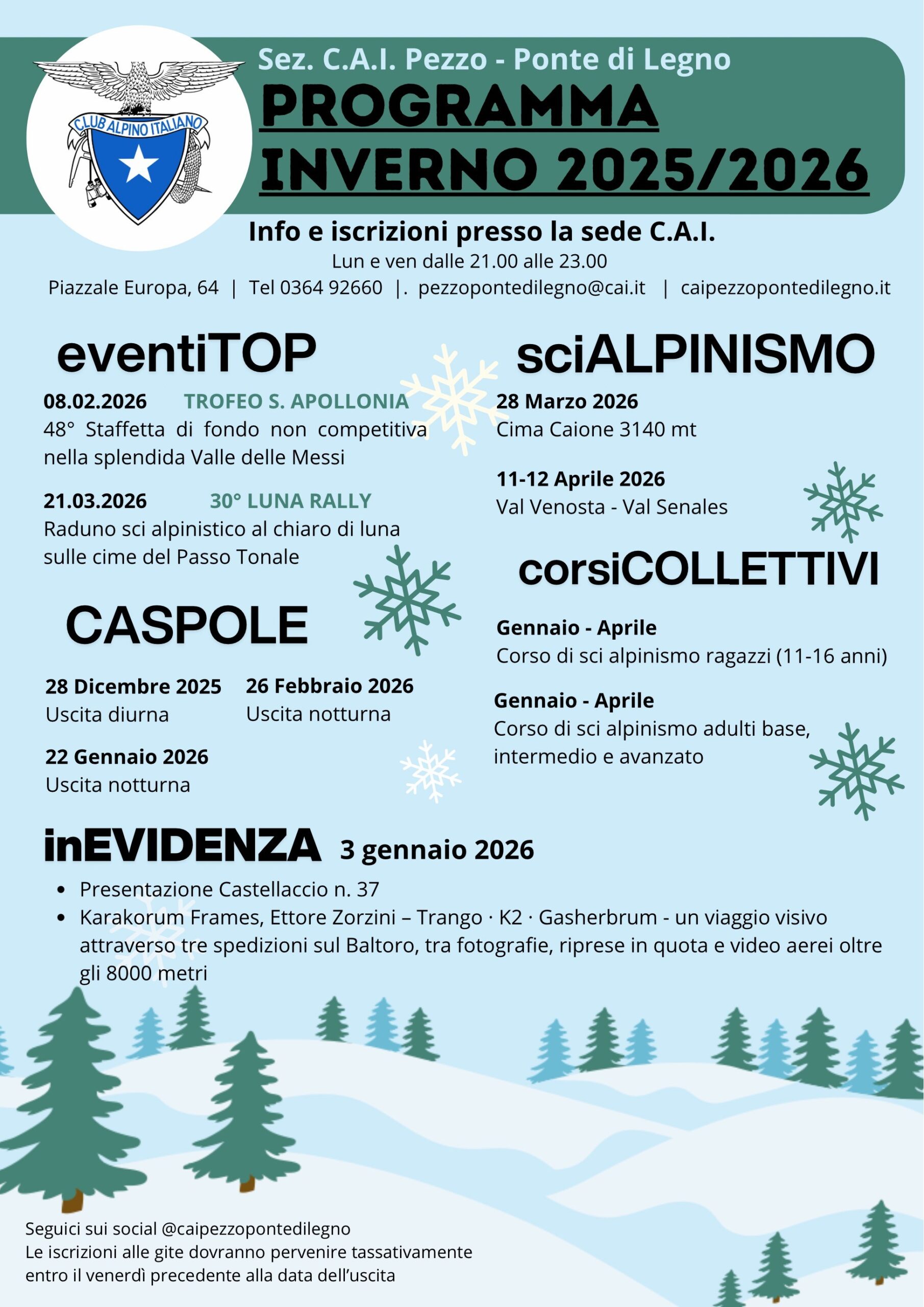 Per tutte le info chiamate o visitate il nostro sito all’indirizzo www.caipezzopontedilegno.it